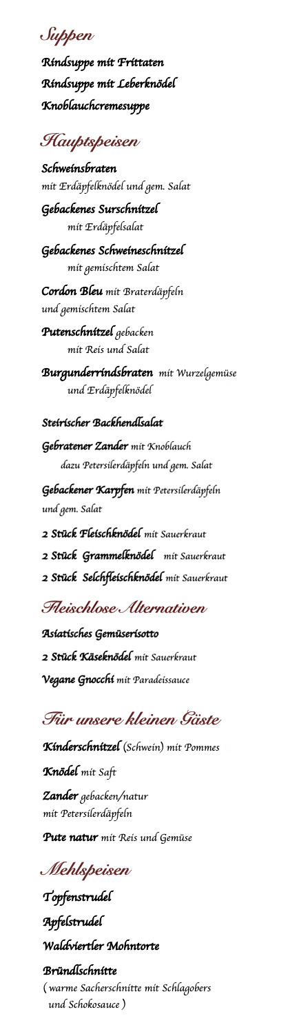 Bei uns servieren wir bodenständige Wirtshausküche, Deftiges und Saisonales von Suppen bis Hauptspeisen und Desserts.